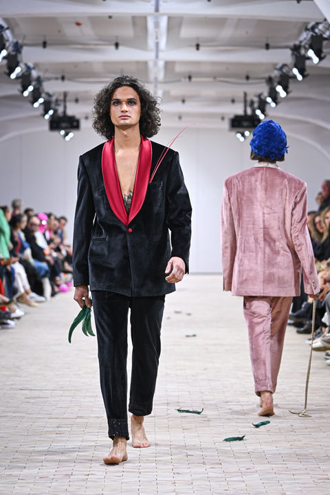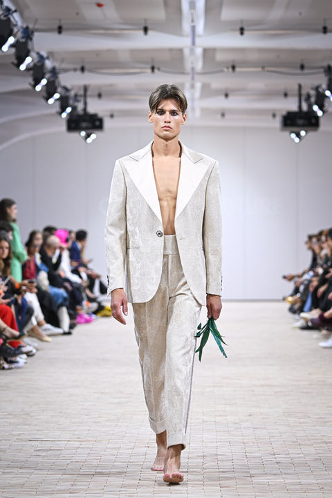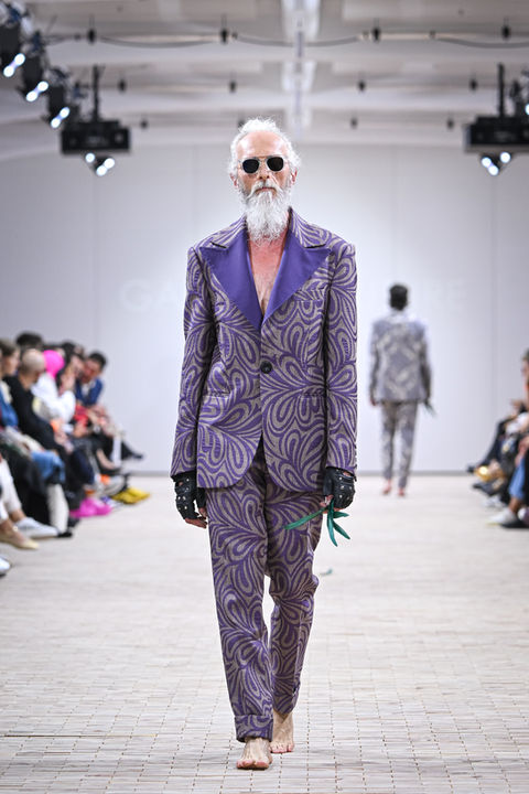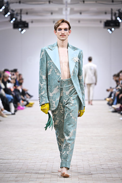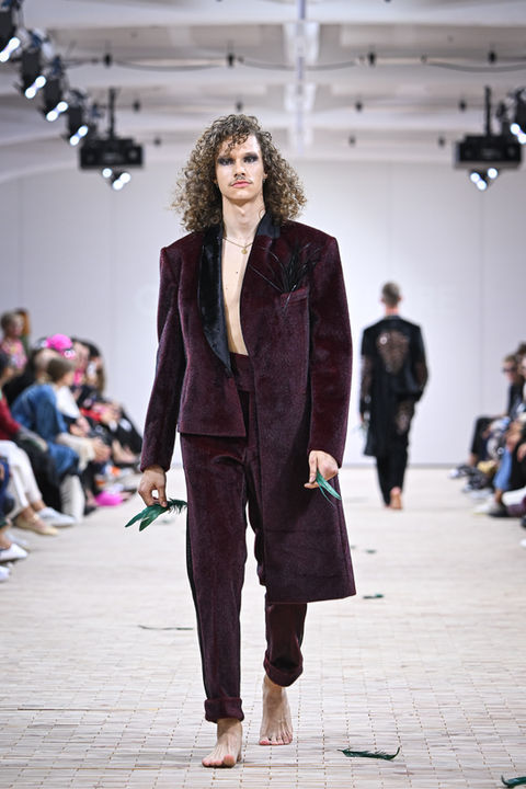 “One of the most highly anticipated returns to Slovenian fashion is longtime costume designer, Milan Gačanovič, with his new brand Gacho Couture. The thirteen made-to-order suits shown at LJBFW were not only lavish and ornate in design but genderless and ageless. Asymetrical hemlines and fabrics usually associated with upholstery, decoration and theatre, make these made to order suits both glamorous and unique.”